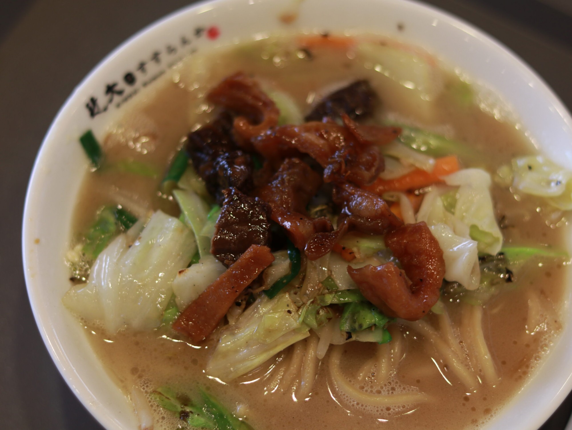 「初代近大ラーメン」(税込850円)は、ホルモンと野菜をたっぷり使⽤し、 ⼤学⽣がしっかりと栄養を取れるように