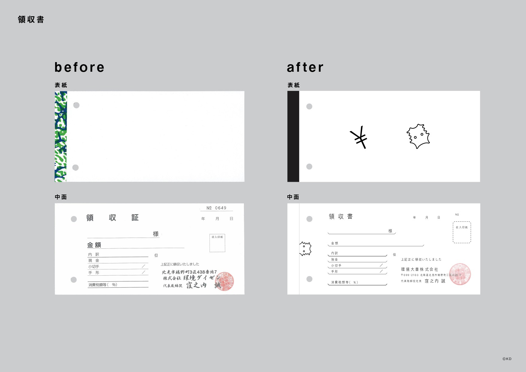 さらには請求書や領収書、封筒など、一般のお客様が目に触れない場所にも採用。窪之内さんいわく、これがインナーブランディングに高く寄与したそうです。